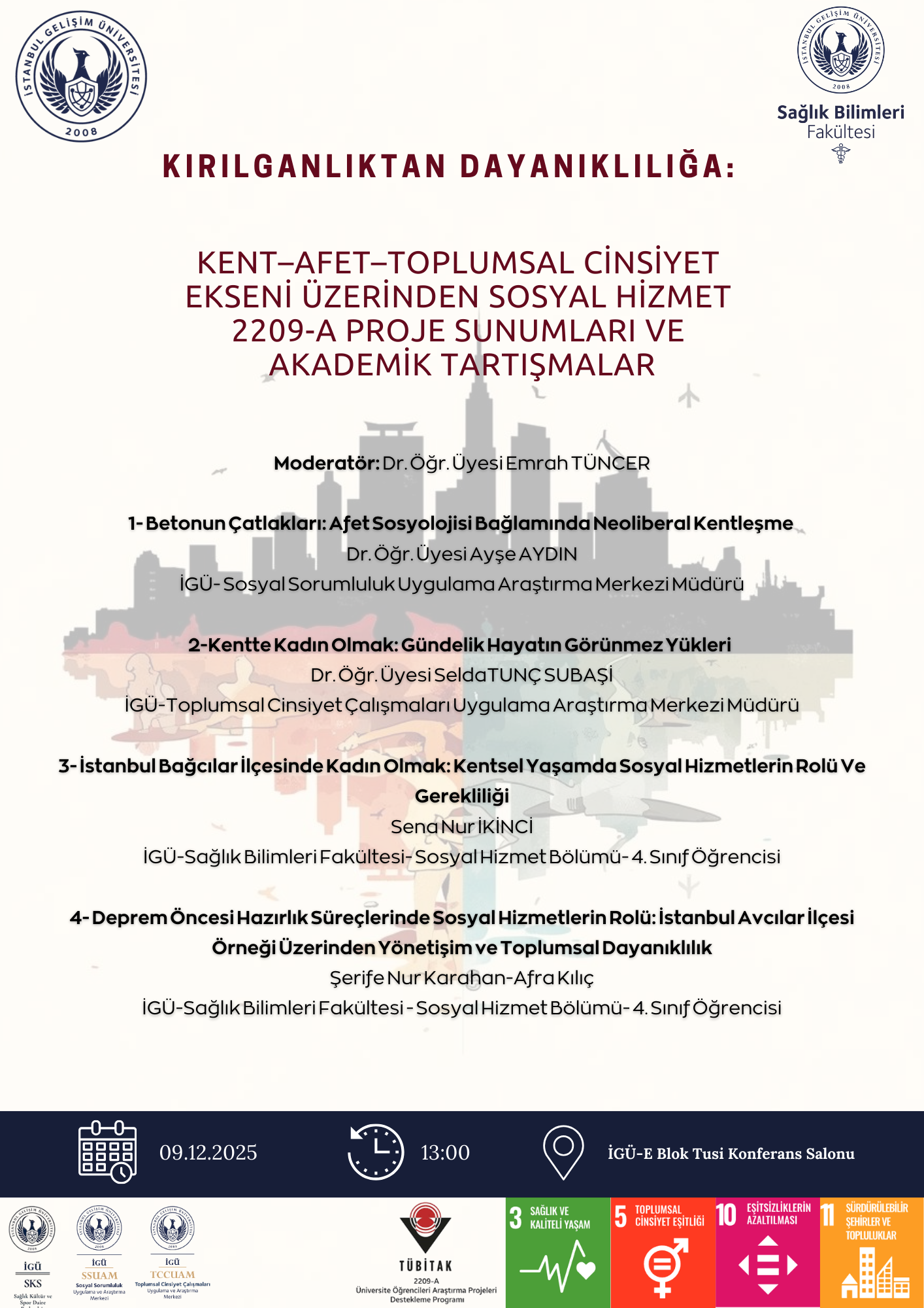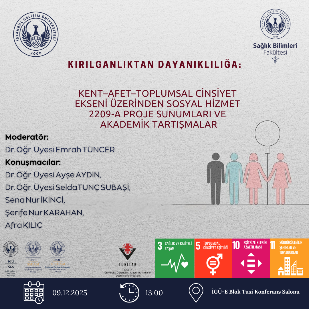 İstanbul Gelişim Üniversitesi Sosyal Sorumluluk Uygulama ve Araştırma Merkezi ile Sağlık Bilimleri Fakültesi Sosyal Hizmet Bölümü tarafından düzenlenen ‘Kırılganlıktan Dayanıklılığa: Kent–Afet–Toplumsal Cinsiyet Ekseni Üzerinden Sosyal Hizmet 2209-A Proje Sunumları ve Akademik Tartışmalar’ başlıklı etkinlik, 9 Aralık 2025 Salı günü, saat 13.00’te E Blok Tusi Konferans Salonu’nda gerçekleştirilecektir.